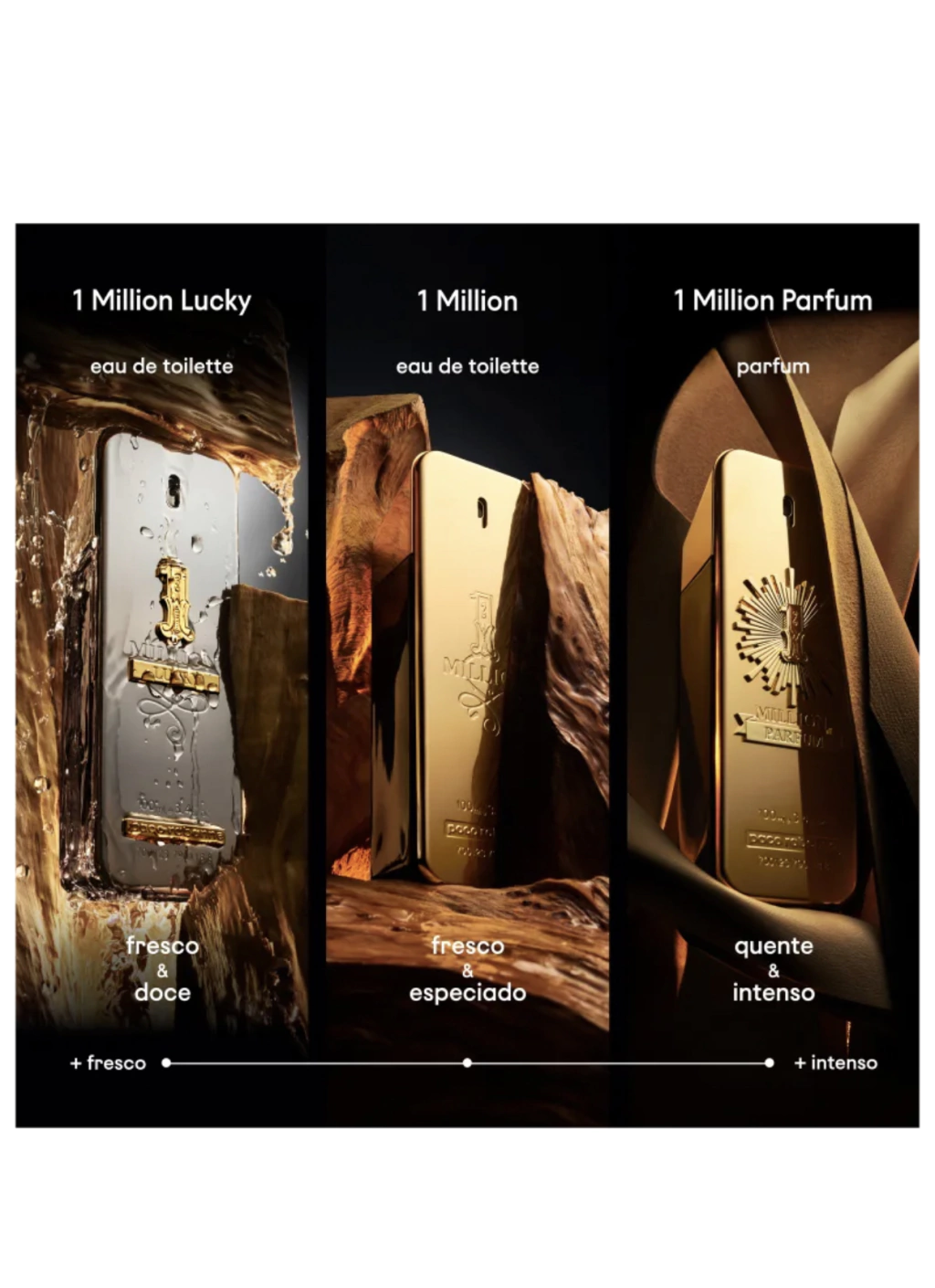 O Perfume Masculino 1 Million Parfum, de Paco Rabanne, traz acordes extravagantes de tuberosa, ambargris e cashmere, combinados com couro e ládano. O perfume One Million traz uma essência sofisticada, que destaca a opulência do couro com um toque salino, retido dentro do famoso frasco luxuoso em formato de uma barra de ouro.